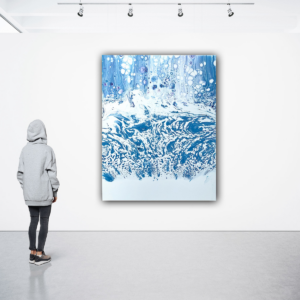 Dieses Werk macht das Unsichtbare spürbar: den Atem – flüchtig, lebensnotwendig, oft unbewusst. In fein nuancierten Weiß- und Blautönen wird das Erleben eines veränderten Atemflusses eingefangen. Die Acryl-Fluidtechnik erzeugt dynamische Strukturen, die an aufsteigende und zerplatzende Luftblasen erinnern – ein Sinnbild für die Zerbrechlichkeit und gleichzeitige Kraft des Atems.