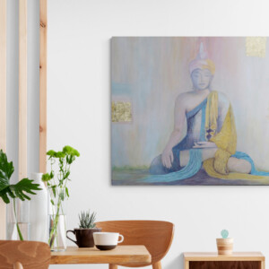 Die Gewandung des Buddha in Türkisgrün und Indischgelb repräsentiert die Harmonie und das Licht der Erleuchtung. Die dezenten Grautöne in den Schattierungen seiner Robe fangen die dynamischen, oft herausfordernden Elemente ein, die den Weg der Weisheit begleiten, während sie gleichzeitig den ruhigen Fluss der inneren Balance verdeutlichen.