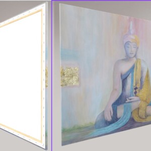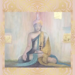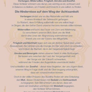 Im Zentrum dieses Werkes steht die Figur des Buddha, umgeben von sanften, unregelmäßigen Farbverläufen, die die Hindernisse darstellen, die unsere innere Klarheit trüben können: Verlangen, Widerwillen, Trägheit, Unruhe und Zweifel. Diese Schleier erinnern uns daran, wie wichtig es ist, in Achtsamkeit und Balance zu leben, um inneren Frieden und tiefere Einsicht zu finden.