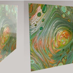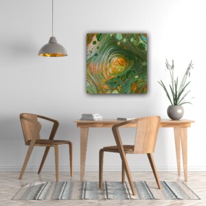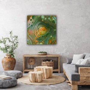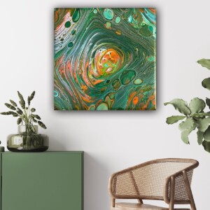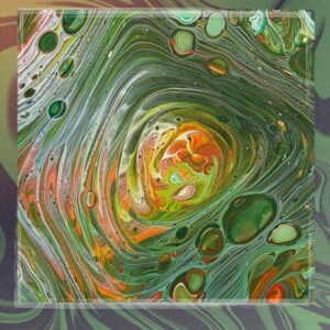 Das überwiegende Phthalogrün bildet den ruhigen Hintergrund und umgibt die intensiven Farben, während es sich im Zentrum mit ihnen verbindet. Es symbolisiert den unveränderlichen Wesenskern, der stets in uns vorhanden ist und in seiner reinsten Form authentisch und beständig bleibt.