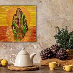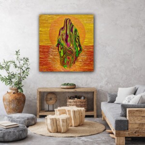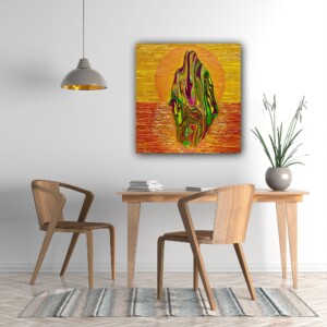 Jeder Schritt in eine gewaltfreie Zukunft beginnt mit einer Vision. In diesem Werk wird die Frauengestalt von einer Gewandung aus kraftvollen, fließenden Farbverläufen in Rot-Violett, Gold, Grün und Gelb umhüllt. Diese symbolische Verschleierung steht für das Unbekannte und das Potenzial einer Vision, die sich nur langsam offenbart. Getragen von Licht, Mut und innerem Feuer geht sie ihren Weg – über Wasser oder Wüstensand, dem orange leuchtenden Sonnenuntergang entgegen. Trotz aller Stürme bewegt sie sich mit unerschütterlicher Hoffnung, die ihre Schritte leitet.
