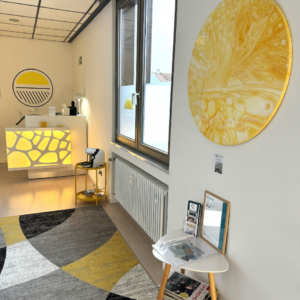 Dieses Werk ist eine Hommage an die harmonische Gestaltung der Empfangstheke in einer Hautarztpraxis. Die minimalistische Farbkomposition aus sanftem Weiß und energetischem Gelb fängt nicht nur die heilende Energie der Sonne ein, sondern greift auch das runde, gelb-weiße Praxislogo auf, wodurch es sich nahtlos in das ästhetische Gesamtkonzept der Räume einfügt.