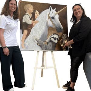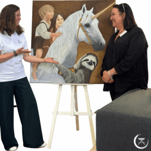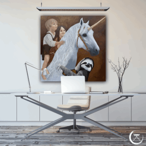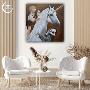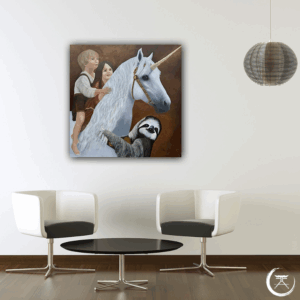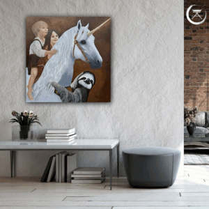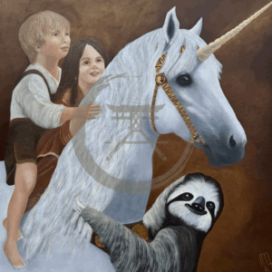 Das weiße Einhorn, dem Stiftungslogo entnommen, steht sinnbildlich für das Magische, Reine und Unversehrte. Behutsam trägt es zwei Kinder auf seinem Rücken – ihr Blick ist voller Vertrauen, ihre Nähe voller Wärme. Frieda, das Stiftungsmaskottchen – ein sanftes, tief in sich ruhendes Faultier – schmiegt sich um den Hals des Einhorns. Sie verkörpert den Rhythmus der Stille – nicht im Takt der Welt, sondern im Einklang mit sich selbst. Ihre Kraft liegt nicht im Tun, sondern im Vertrauen: darauf, dass das Leben trägt – auch dann, wenn sie ihr eigenes Tempo wählt. Eine stille Erinnerung daran, dass wahre Entwicklung Zeit braucht.
